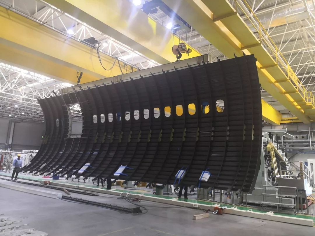2018年12月26日,CR929項(xiàng)目復(fù)合材料前機(jī)身攻關(guān)全尺寸筒段(15米×6米)順利實(shí)現(xiàn)總裝下線,標(biāo)志著CR929項(xiàng)目復(fù)材結(jié)構(gòu)研制向前邁出了重要一步。