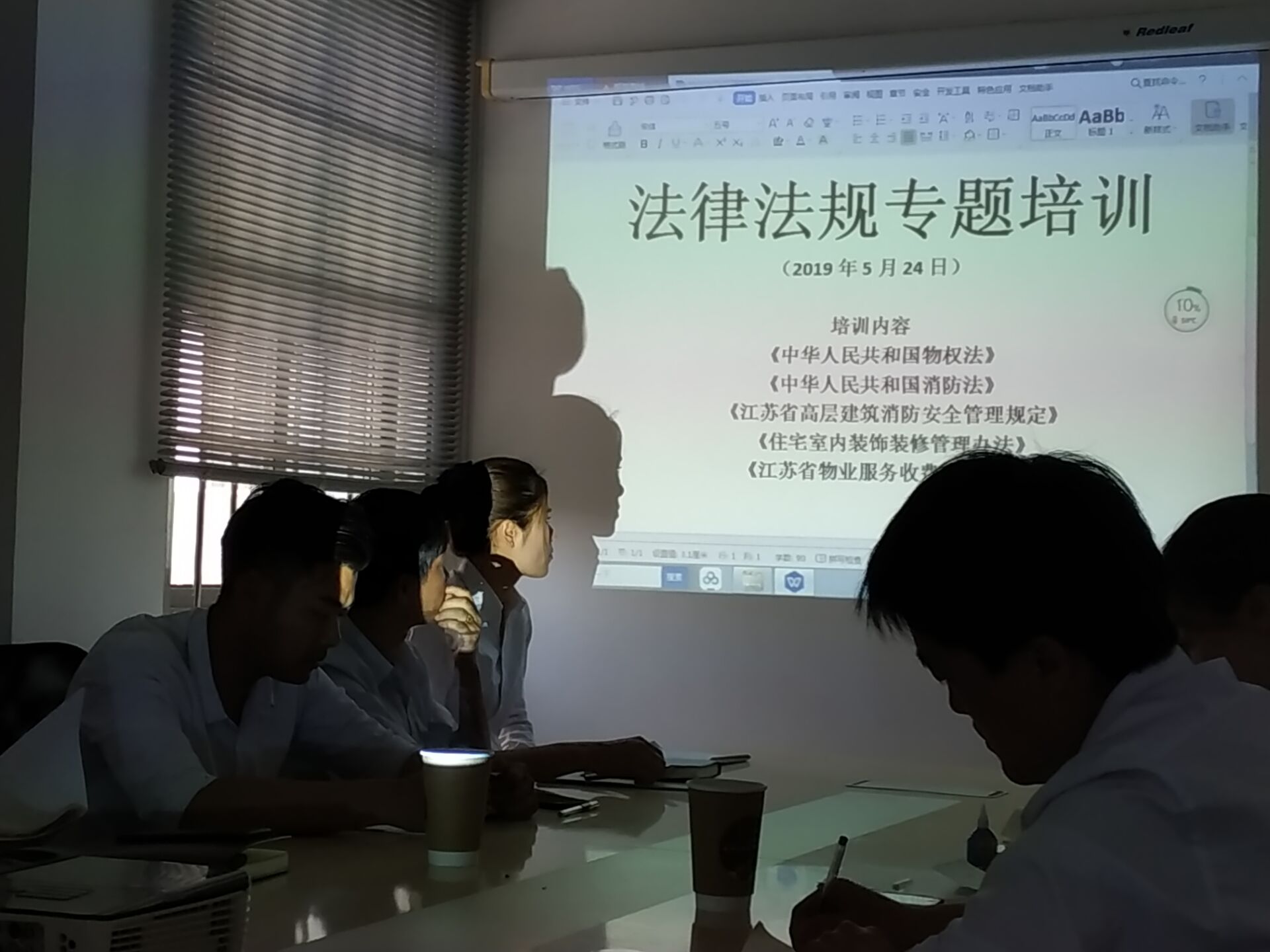 本次培訓(xùn)的內(nèi)容主要有:《中華人民共和國物權(quán)法》、《中華人民共和國消防法》、《江蘇省高層建筑消防安全管理規(guī)定》 、 《住宅室內(nèi)裝飾裝修管理辦法》 、 《江蘇省物業(yè)服務(wù)收費管理辦法》等五部法律法規(guī)。